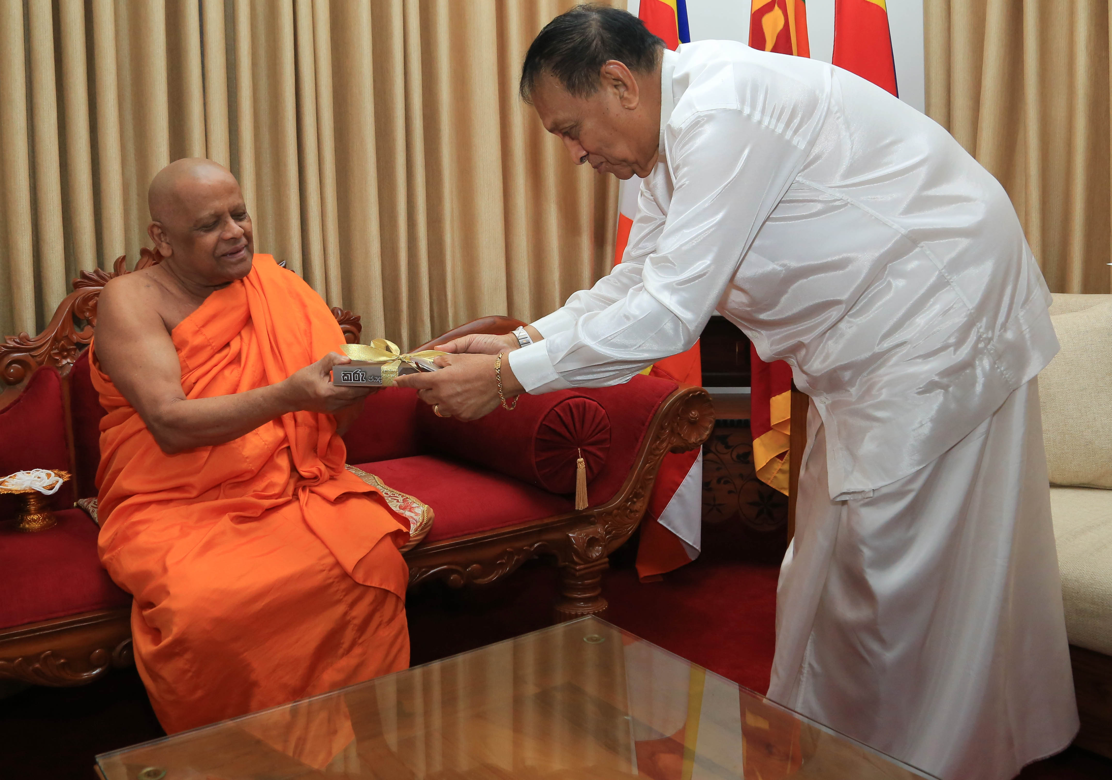 Speaker Karu Jayasuriya visited the Chief Prelates of the Malwatte and Asgiriya this morning to present the original of his biography to the Mahanayakes.