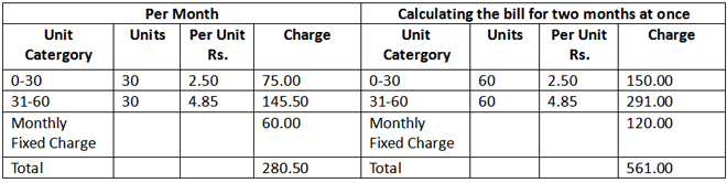 Electricity consumer who uses up to 60 units per month will be charged as follows when issuing electricity bills for two months at once.