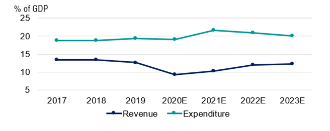 Fiscal deficit to reach ~11.3% of GDP in 2021, with government revenue at ~10.3% of GDP