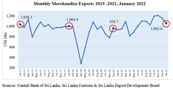 Sri Lanka’s merchandise exports increased by 13% to US$ 1,062.63 Million in January 2022 compared to January 2021 as per the data released by the Sri Lanka Customs. Further, it is a 5.7% increase when compared to January 2020.