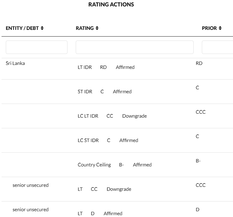 FitchRatings has downgraded Sri Lanka’s Long-Term Local-Currency Issuer Default Rating (IDR) to ‘CC’, from ‘CCC’, and has affirmed the Long-Term Foreign-Currency IDR at ‘RD’ (Restricted Default). Fitch typically does not assign Outlooks to ratings of ‘CCC+’ or below.