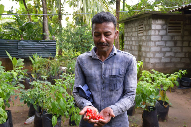 Reducing our farming practices near the tank bundt, has resulted in us receiving a higher income. It has been a great benefit to us, and it’s all thanks to the Project.” Sunil, with his wife Rohini Pushpalatha now runs an organic home garden in their backyard. With the support of the CRIWMP’s climate smart agriculture programme, their home garden boasts of an array of chili, nai miris (scotch bonnet), pineapple, June plum, moringa, coconut, mango, tomato, banana plants, cowpea, cashew, soursop, turmeric, ginger and areca nut. “We didn’t even have home gardens before. These were introduced to us through the project. With the support received, we only had to account for the labour and water costs for the garden. We have an increase of about 50% in our income and barely buy any vegetables from outside, which helps us save a lot of money. We can carry out our day-to-day life thanks to the funds we earn through home gardening introduced by the project.”