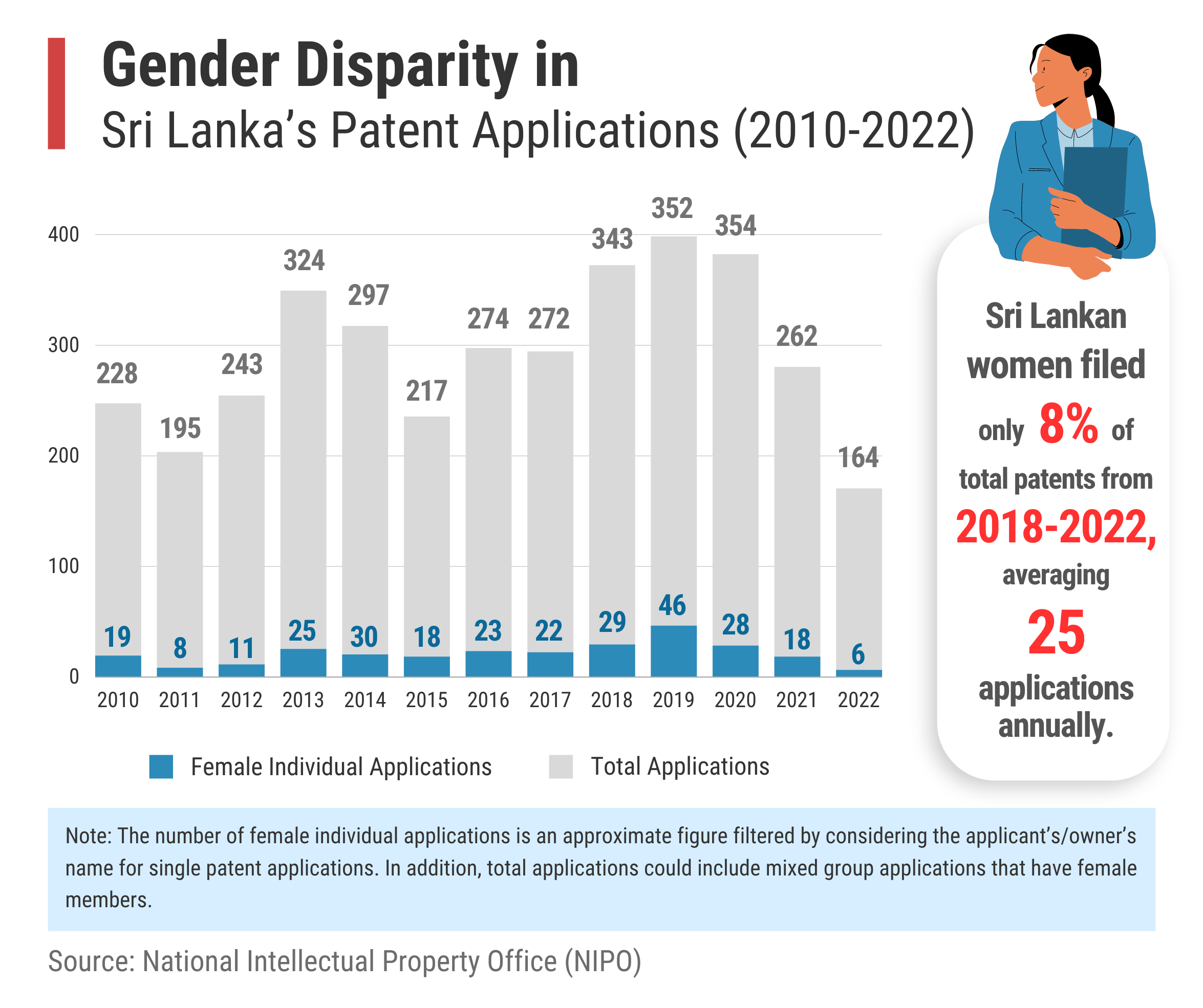 The number of patent applications issued to women is a crucial and commonly used indicator to determine their involvement in innovation. However, Sri Lanka does not have gender-specific patent application data. Based on approximate calculations, the number of individual female patent applications fluctuated between 2010 and 2022, averaging nearly 25 patent applications per year in the last five years (Infographic 1). This represents only 8% of the total patent applications during that period.