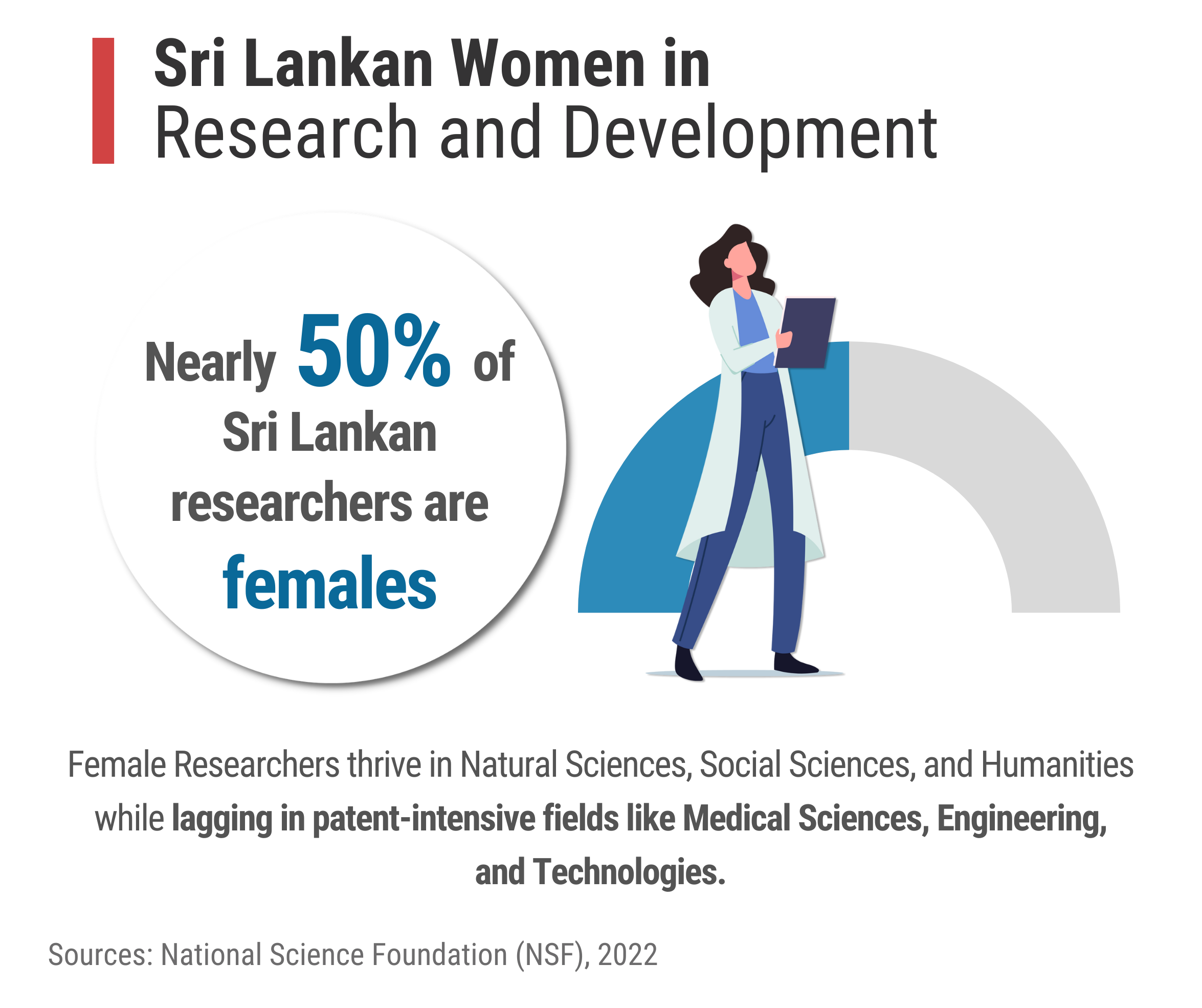 Women’s involvement in research and development (R&D) activities, one of the key components of innovations, is at a satisfactory level in Sri Lanka. According to the National R&D survey conducted by the National Science Foundation (NSF) in 2020, nearly 50% of researchers in the country are females. This figure is the highest percentage when compared with other South Asian countries. However, in total, the output indicators of R&D, such as the number of patents, journal publications, commercialisation, etc., are low in Sri Lanka. Further, the low number of female patents reveals that most women are involved in less patent-intensive fields, such as natural sciences, social sciences and humanities. Moreover, female researchers are uninterested in commercialising their inventions or using them for commercial purposes. There could be several reasons for this, such as a lack of awareness of IPRs and their importance, lack of incentives and institutional support for research commercialisation, and lack of targeted programmes to promote women’s innovations.