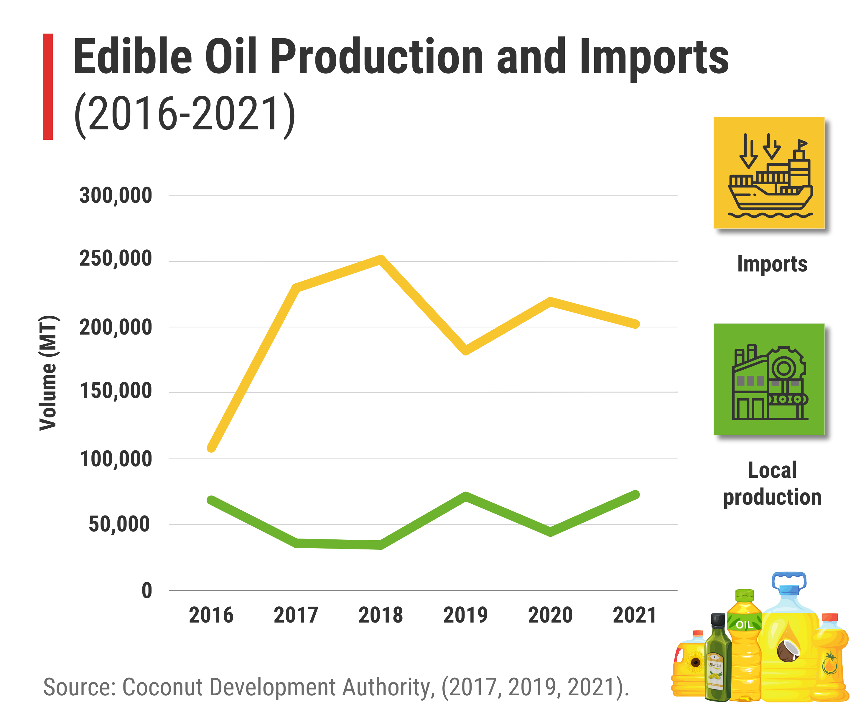Meeting the local edible oil demand in Sri Lanka is indeed a challenge without imports. Nearly 74% of the demand is met through imports. Local palm oil supplies 6% and the rest is through local coconut oil, which varies with annual coconut production. While coconut oil is often considered a substitute, the current coconut production capacity is inadequate and does not remain a perfect substitute for industrial needs owing to different properties and prices. Given the limited land availability for expanding commercial cultivations in Sri Lanka for coconut and oil palm, productivity improvements would support partially bridging the gap. This can be facilitated by lowering the import tariff on edible oils, easing the burden on consumers. Adopting modern and safe oil production technologies such as virgin coconut oil and promoting high value-added products such as lauric acid for the export market are crucial to mitigate the impact on the coconut oil industry. Considering the economic crisis and foreign exchange deficit, a comprehensive evaluation of feasible alternatives is necessary.