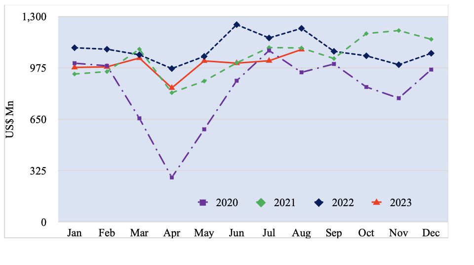 Figure 1: Monthly Merchandise Export Performance 2020 – August, 2023