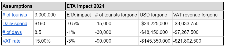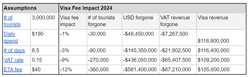 Based on the three scenarios below, switching from ETA to visa-on-arrival à la the Maldives or Singapore should generate between $24 million to $145 million in additional tourism revenue. The precise number is not especially relevant. The point is that these roughly right numbers are substantial enough to generate a robust prima facie case for experimenting with opening up visa-on-arrival and optimising the ETA experience.