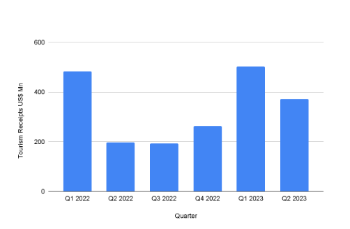 After a sharp decline in 2020 and 2021, tourism receipts saw a slight increase in 2022, reaching US$1,136.30 million. The first two quarters of 2023 also showed positive signs, with receipts totaling US$503.9 million in Q1 and US$371.1 million in Q2.