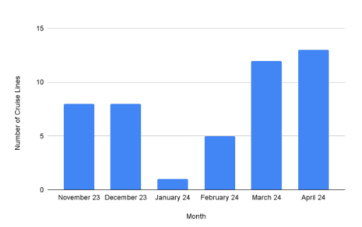 Total upcoming cruise arrivals to major ports by month Nov. 2023 – Apr. 2024