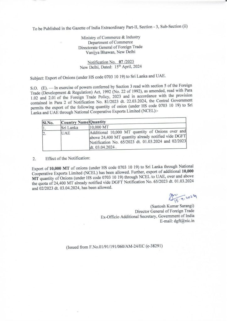 The government of India has lifted the export ban on onions for Sri Lanka, with export of up to 10,000 MT of onions permitted vide the enclosed notification of the Directorate General of Foreign Trade.