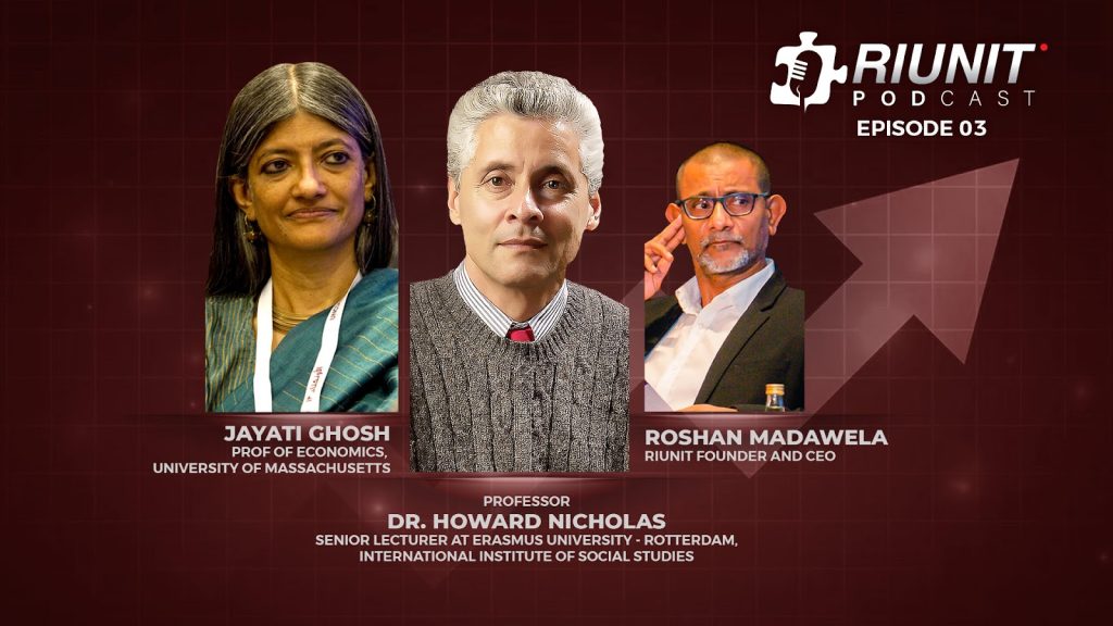 In the latest series of the RIUNIT podcast hosted by Roshan Madawela, distinguished economists Prof. Howard Nicholas and Prof. Jayati Ghosh, delve deeply into the rapidly changing economic and geopolitical environment, examining both local and global economic orders. By questioning popular narratives, they provide insightful analysis and perspectives on the complex forces shaping our world today.