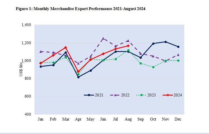 Consequently, total exports for August 2024, including both merchandise and services, were recorded at US$ 1,483.13 million, increasing 4.67 % over the corresponding period of 2023.