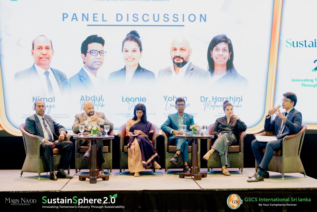 The panel included key figures such as N.S. Gamage, Deputy Director General of Environmental Impact Assessment from the Central Environmental Authority of Sri Lanka; Leonie Vaas, General Manager of Sustainability at Hirdaramani Group; Dr. Harshini Mallawarachchi from the University of Moratuwa; and Yohan Lawrence, Secretary General of the Joint Apparel Association Forum (JAAF), each contributing their expertise to highlight the importance of sustainability across various sectors.