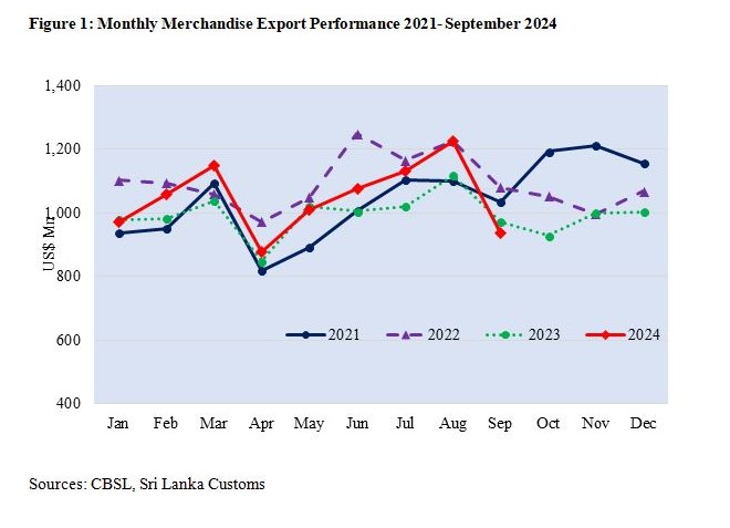 Consequently, total exports for September 2024, including both merchandise and services, were recorded at US$ 1,267.84 million, decreasing 1.17 % over the corresponding period of 2023.