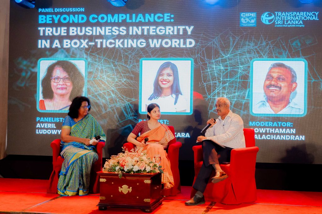 The report launch was followed by a panel discussion titled “Beyond Compliance: True Business Integrity in a Box-Ticking World”. Panellists included Averil Ludowyke, an Independent Non-Executive Director at several leading private sector organisations, and Rukshani Wanigasekara, Senior Manager Corporate Legal at Cargills Ceylon. The session was moderated by Gowthaman Balachandran, Chief of Party for the Transparent and Accountable Governance Project supported by USAID.