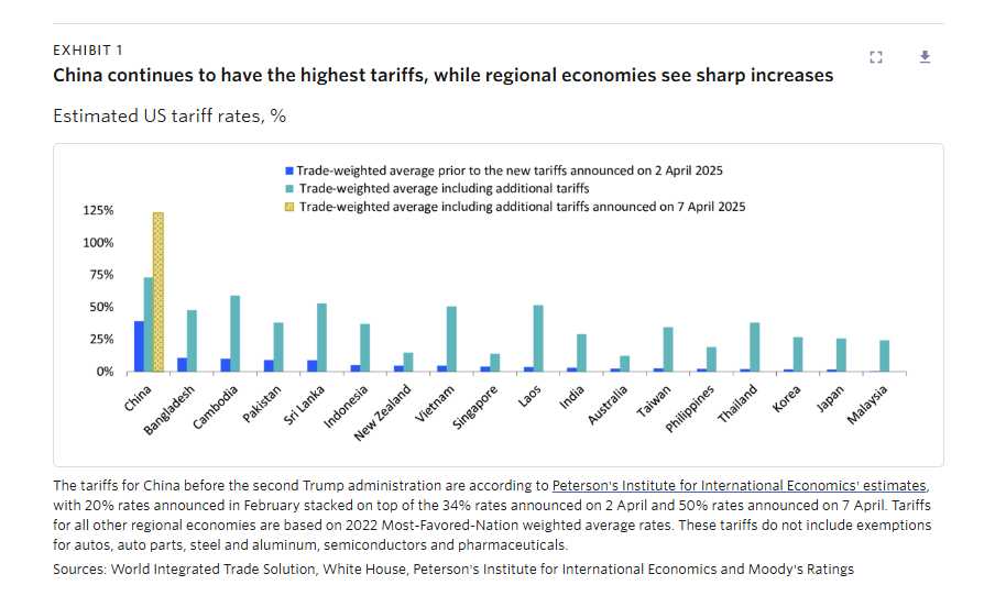 Some of the highest tariffs (>30%) were applied to a number of economies in the ASEAN bloc, such as Cambodia (B2 stable), Laos (Caa3 stable), Vietnam (Ba2 stable), Thailand (Baa1 stable) and Indonesia (Baa2 stable), as well as South Asian economies such as Bangladesh (B2 negative) and Sri Lanka (Caa1 stable).
