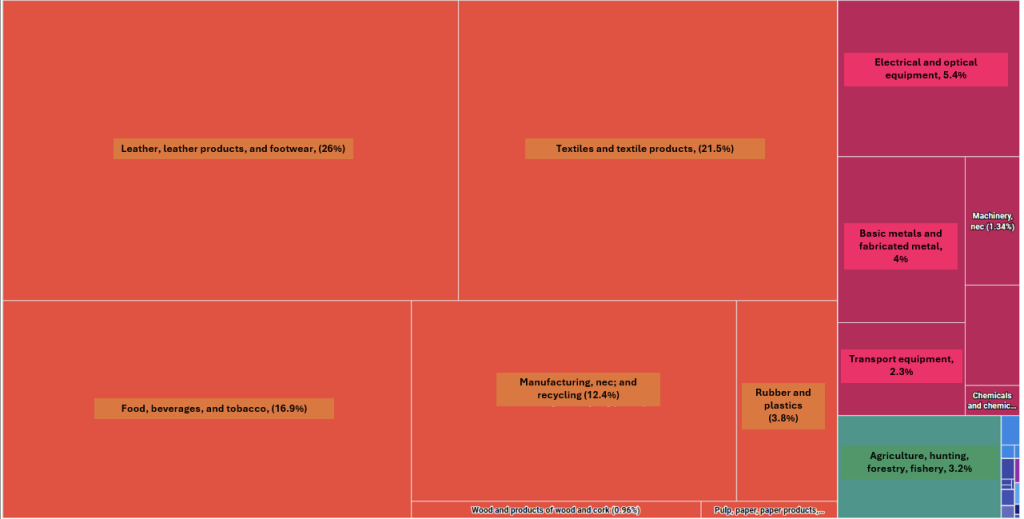 Evidence-based analysis is essential for guiding targeted support. Sectoral data highlights how Thailand, for example, is indirectly impacted through its upstream supply chain linkages with Viet Nam. The following Thai manufacturing sectors are identified as the most vulnerable: Leather and Textiles, Food and Beverages, other Light Manufacturing, Electrical Equipment (figure 3). This insight suggests that coordination between Thailand and Viet Nam focusing on these industries could mitigate shared risks and enhance resilience.