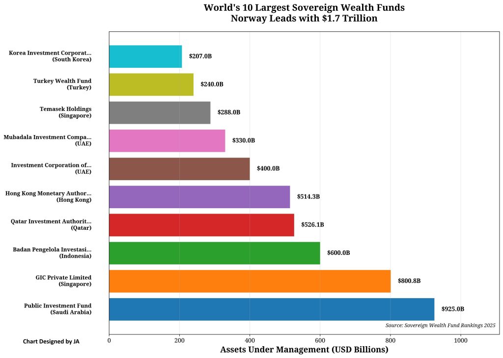 Norway’s Government Pension Fund Global, established in 1990, now commands $1.74 trillion in assets—larger than the economies of most nations. In 2023 alone, it generated $222 billion in returns, creating fiscal space equivalent to three times Sri Lanka’s entire GDP. China’s twin funds—China Investment Corporation ($1.35 trillion) and SAFE Investment Company ($1.09 trillion)—have transformed foreign exchange reserves into global investment power, acquiring strategic assets from London real estate to African infrastructure.