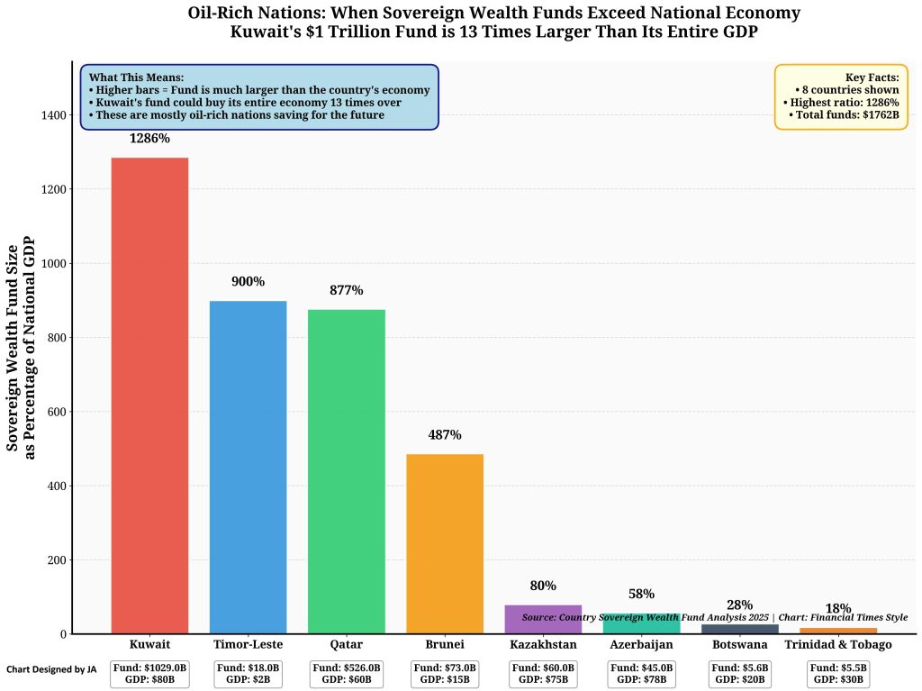 Even more striking: Timor-Leste, with a GDP of just $3.2 billion, has accumulated $18.6 billion in its Petroleum Fund—nearly six times its annual economic output. This fund finances 80% of the state budget, transforming a post-conflict nation into one with greater per-capita sovereign savings than many developed economies.