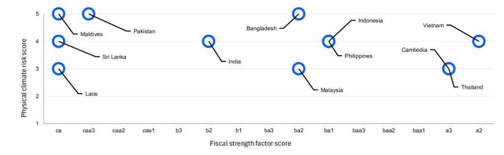 Sri Lanka, along with Indonesia (Baa2 stable), the Philippines (Baa2 stable), and Vietnam (Ba2 stable), all have high credit exposure to physical climate risks. However, Moody’s specifically points out that Sri Lanka has much weaker fiscal capacity to increase its resilience than its regional neighbors.