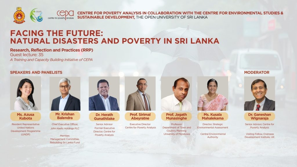 The Centre for Poverty Analysis (CEPA), in collaboration with the Centre for Environmental Studies and Sustainable Development of the Open University of Sri Lanka, will host a high-level policy panel titled “Facing the Future: Environmental Disastersand Poverty in Sri Lanka”on 26 January 2026, from 3.30 p.m. to 6.00 p.m., at the Auditorium of the Faculty of Health Sciences, Open University of Sri Lanka, Nawala.