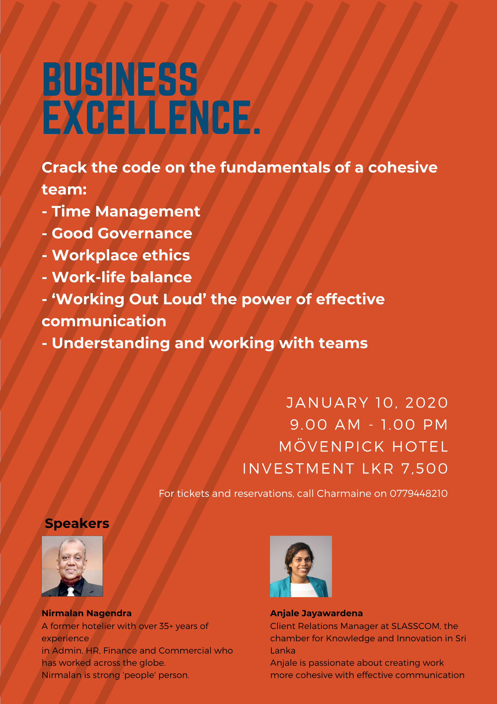A training on Business Excellence will be conducted at the Mövenpick Hotel on the 10th of January 2020. The session will cover the areas of time management, good governance, work place ethics, workplace communications – all aimed at creating cohesive teams to increase the productivity in the organization. The session will be conducted by Nirmalan […]
