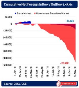November 9, 2018 (LBO) – Foreign selling of Sri Lanka’s stocks and bonds continued at a brisk pace in the second full week of Sri Lanka’s constitutional crisis. Net foreign selling of government securities was Rs9.9bn for the week, while net foreign selling of equities was Rs3.9bn. In the previous week the figures were strikingly […]