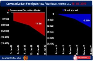 January 18, 2019 (LBO) – Foreign institutional investors have continued to sell Sri Lanka’s bonds and stocks, even after Sri Lanka’s constitutional crisis has been resolved. Figures up until the 18th of January 2019 show Rs19bn (US$100mn) in net foreign selling out of Sri Lanka’s government bond markets. Equity markets showed net outflows of Rs2.3bn […]