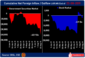 August 24, 2019 (LBO) – The 2018-2019 foreign exodus from Sri Lanka’s government bond markets has picked up speed in recent weeks with total net outflows for the 2018-2019 period now totalling over Rs200bn (US$1.1bn). In the last week alone foreign institutions withdrew a net US$72mn from Sri Lanka’s treasury bond markets amid a second […]