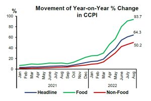 CCPI based headline inflation increased to 64.3-pct in August; food inflation increased to 93.7-pct