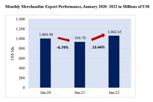 Sri Lanka’s exports increased by 13-pct in January 2022
