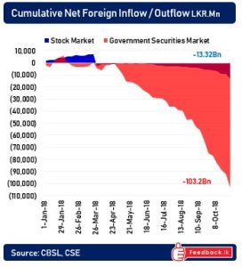 November 9, 2018 (LBO) – Foreign selling of Sri Lanka’s stocks and bonds continued at a brisk pace in the second full week of Sri Lanka’s constitutional crisis. Net foreign selling of government securities was Rs9.9bn for the week, while net foreign selling of equities was Rs3.9bn. In the previous week the figures were strikingly […]