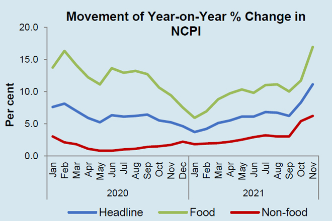 Headline inflation, as measured by the year-on-year (Y-o-Y) change in the National Consumer Price Index, increased to 11.1 percent in November 2021 from 8.3 percent in October 2021 driven by monthly increases of prices of items in both Food and Non-food categories. Subsequently, Food inflation (Y-o-Y) increased to 16.9 percent in November 2021 from 11.7 […]